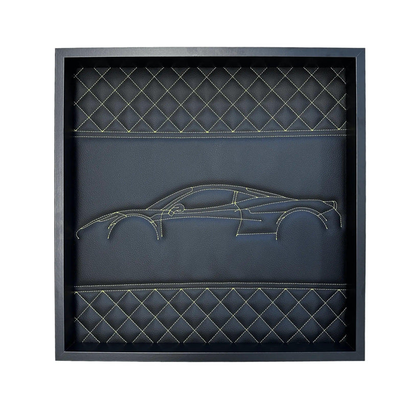細部にまで細心の注意を払って丁寧に作られた当社の壁装飾は、プレミアム ブラック レザーに巧みに型押しされたフェラーリ 488 の象徴的なシルエットを表しています。印象的なイエローのステッチがあらゆる輪郭を強調し、注目を集める視覚的に魅惑的な傑作を生み出しています。