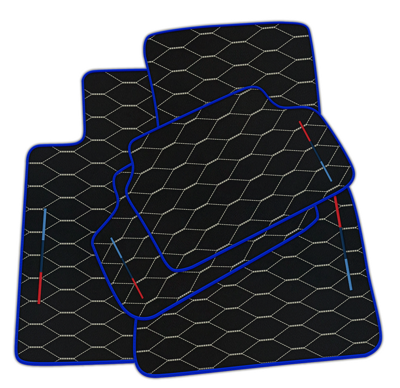 Veredeln Sie den eleganten Look Ihres BMW mit diesen schwarzen Lederfußmatten. Das einzigartige Viper Hex-Muster mit weißen Nähten und dunkelblauem Rand verleiht Ihrem Fahrzeug einen Hauch von Luxus. Dank der Tricolor M-Technologie bieten diese Matten höchste Haltbarkeit und Stil.