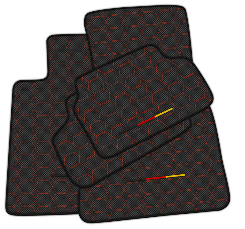 Elevate your BMW with our Carbon Fiber Floor Mats. With a sleek hexagon hex pattern, red stitching, and the German flag, these floor mats combine style and functionality. Made with high-quality carbon fiber material, they provide superior durability and protection for your car's floors.