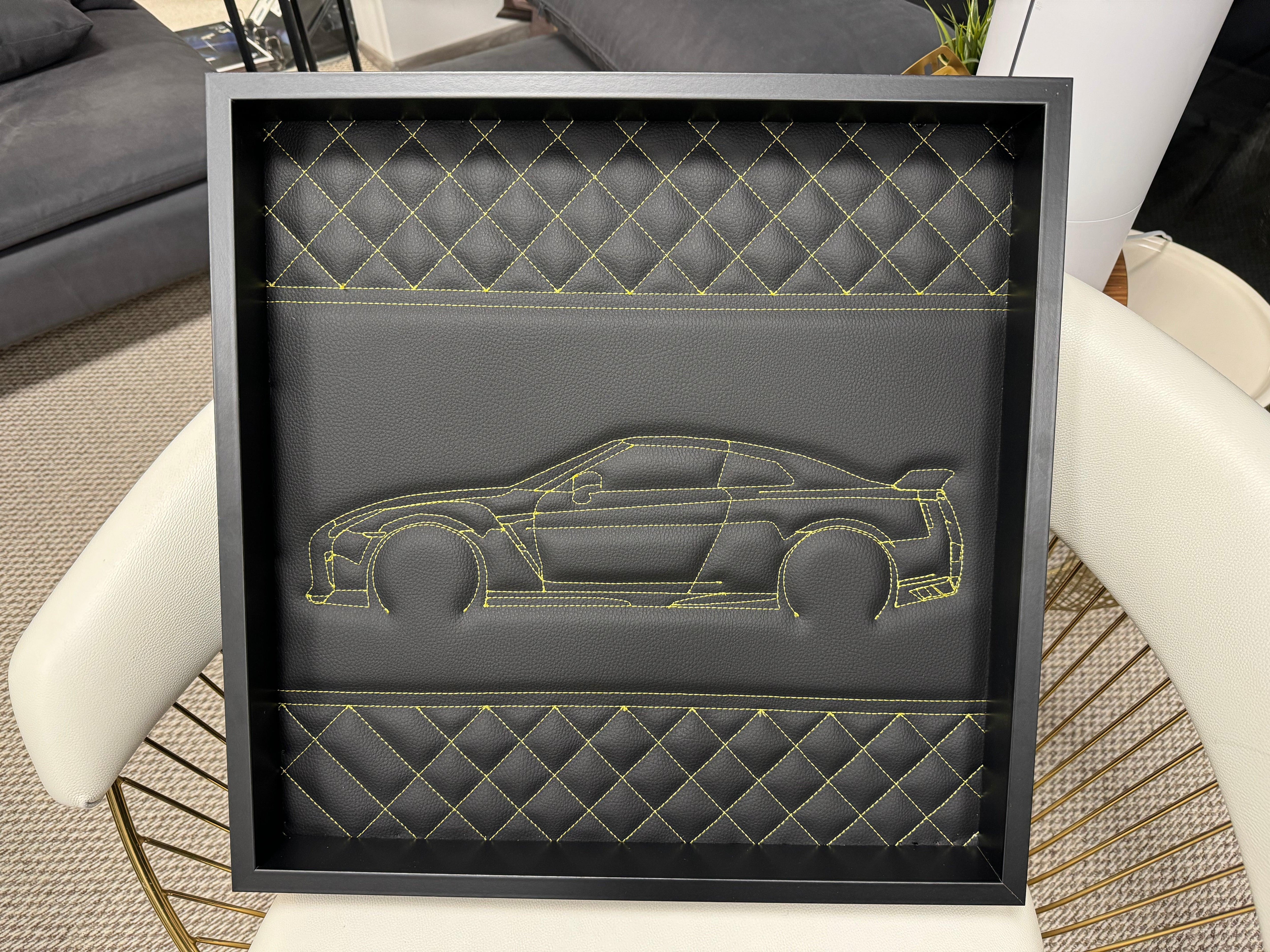 Black Leather Nissan GTR Inspired Wall Art: Embroidered Yellow Stitch Luxury Decor