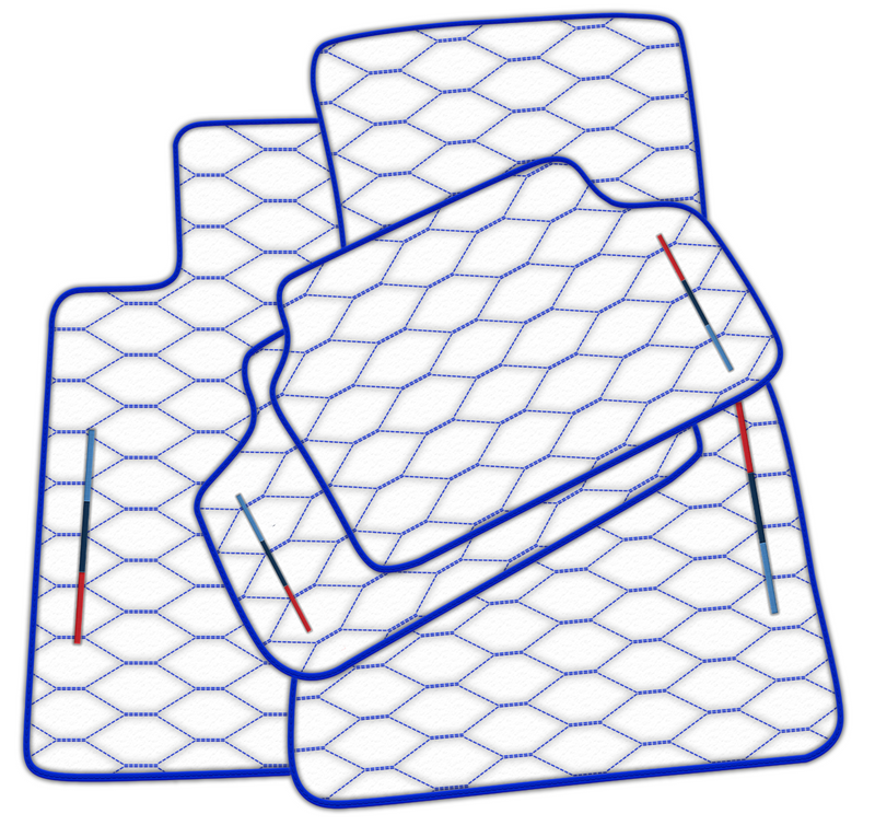 Expertly crafted for BMW, our White Leather Floor Mats offer a sleek and luxurious look. With Viper Hex Pattern blue stitching and dark blue trim, these mats elevate the overall aesthetic of your vehicle. Made with Tricolor m, they provide both style and functionality.