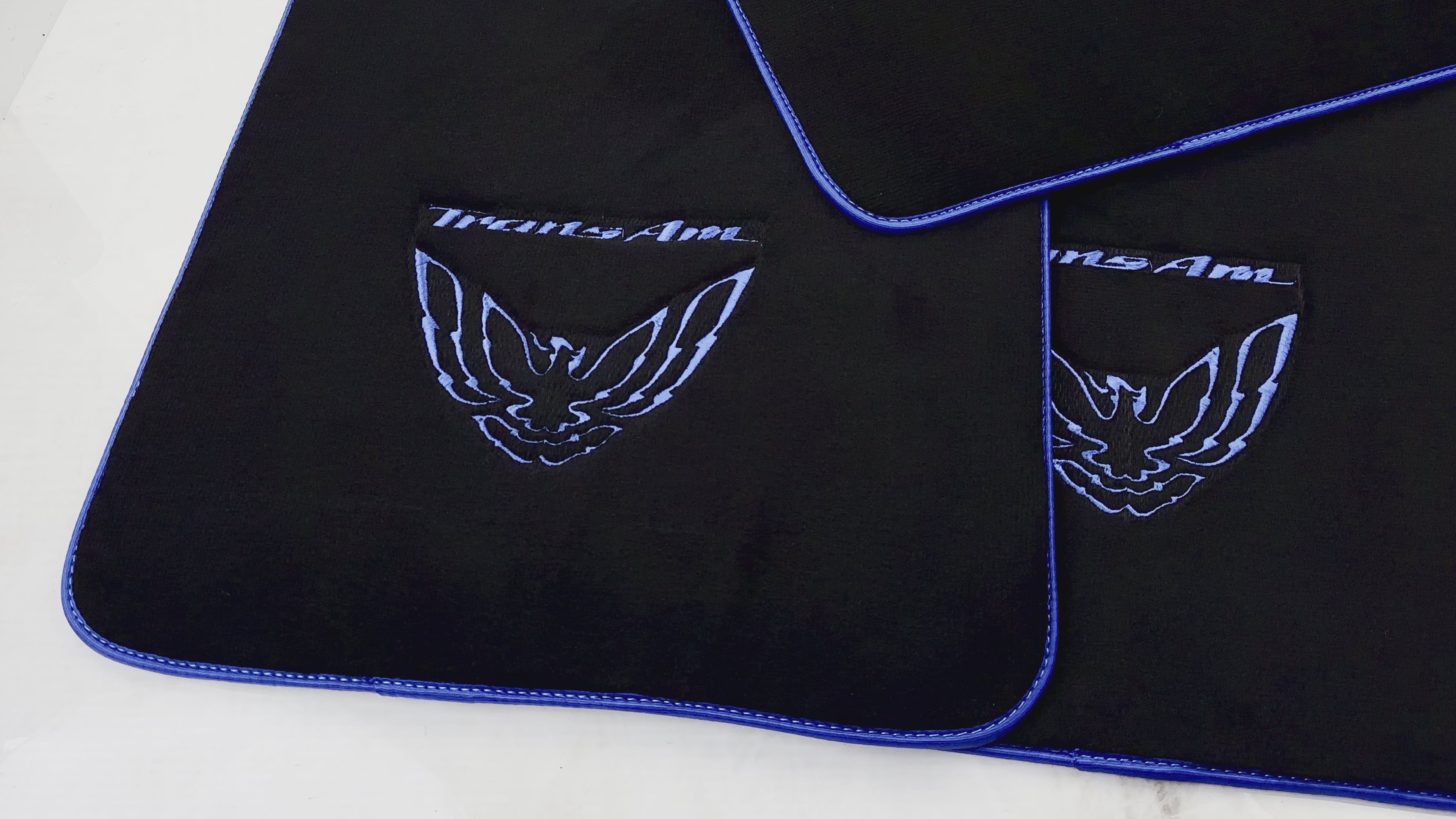 トランザム ロゴ付きポンティアック 初代ファイアーバード (1967-1969) 用ブラック フロアマット (ブルー トリム付き)